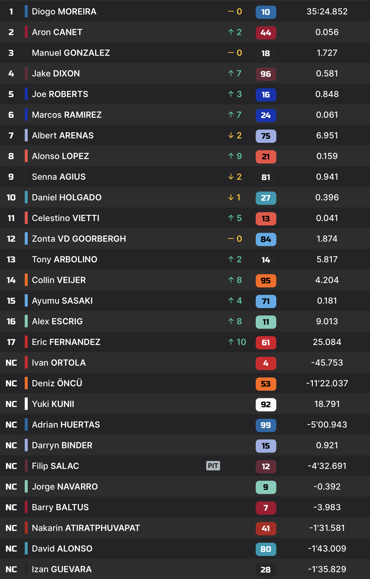 Le leader du championnat pointe alors à 3,6 secondes de la tête, sur le podium provisoire. Aron Canet n’a donc plus droit à l’erreur dans son duel avec Diogo Moreira. Toute perte de temps ou incident, doit être évitée.