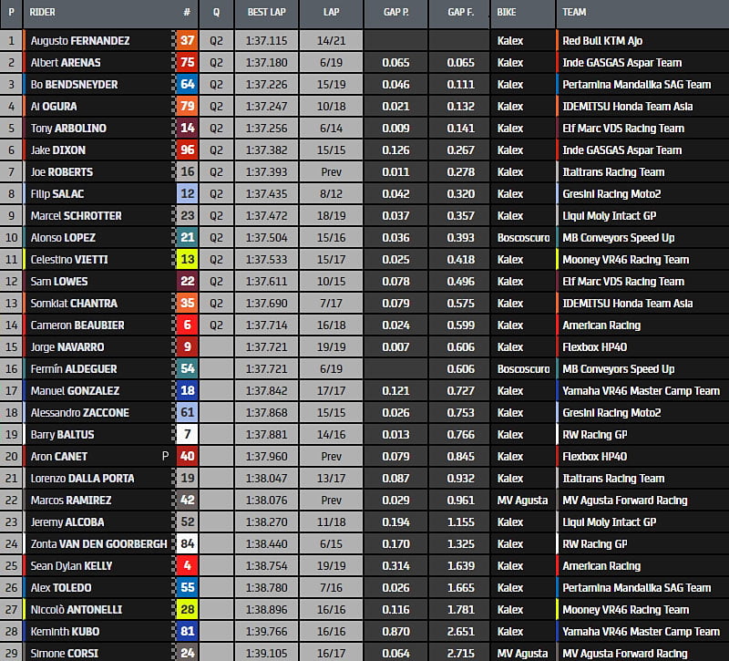Fin de session dominée par Fernandez. Les 13 autres pilotes qualifiés pour la Q2 sont : Arenas, Bendsneyder, Ogura, Arbolino, Dixon, Roberts, Salac, Schrotter, Lopez, Vietti, Lowes, Chantra et Beaubier.