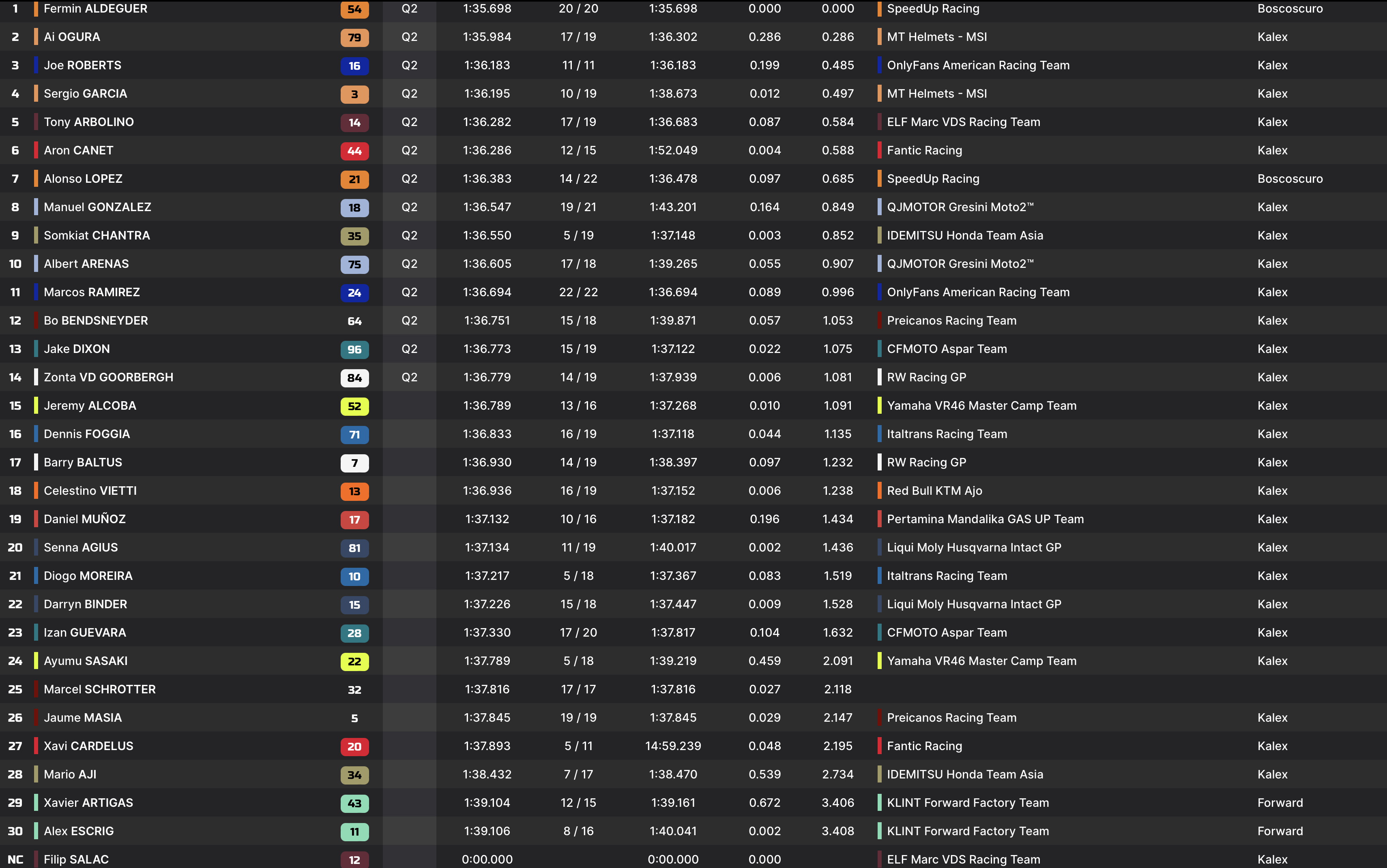 L’action en piste se poursuit malgré tout, et le record du tour tombe enfin. À deux minutes de la fin du temps imparti, Fermin Aldeguer devient le premier pilote de Moto2 à inscrire un temps sous la minute 36, et prend ainsi la tête du classement.