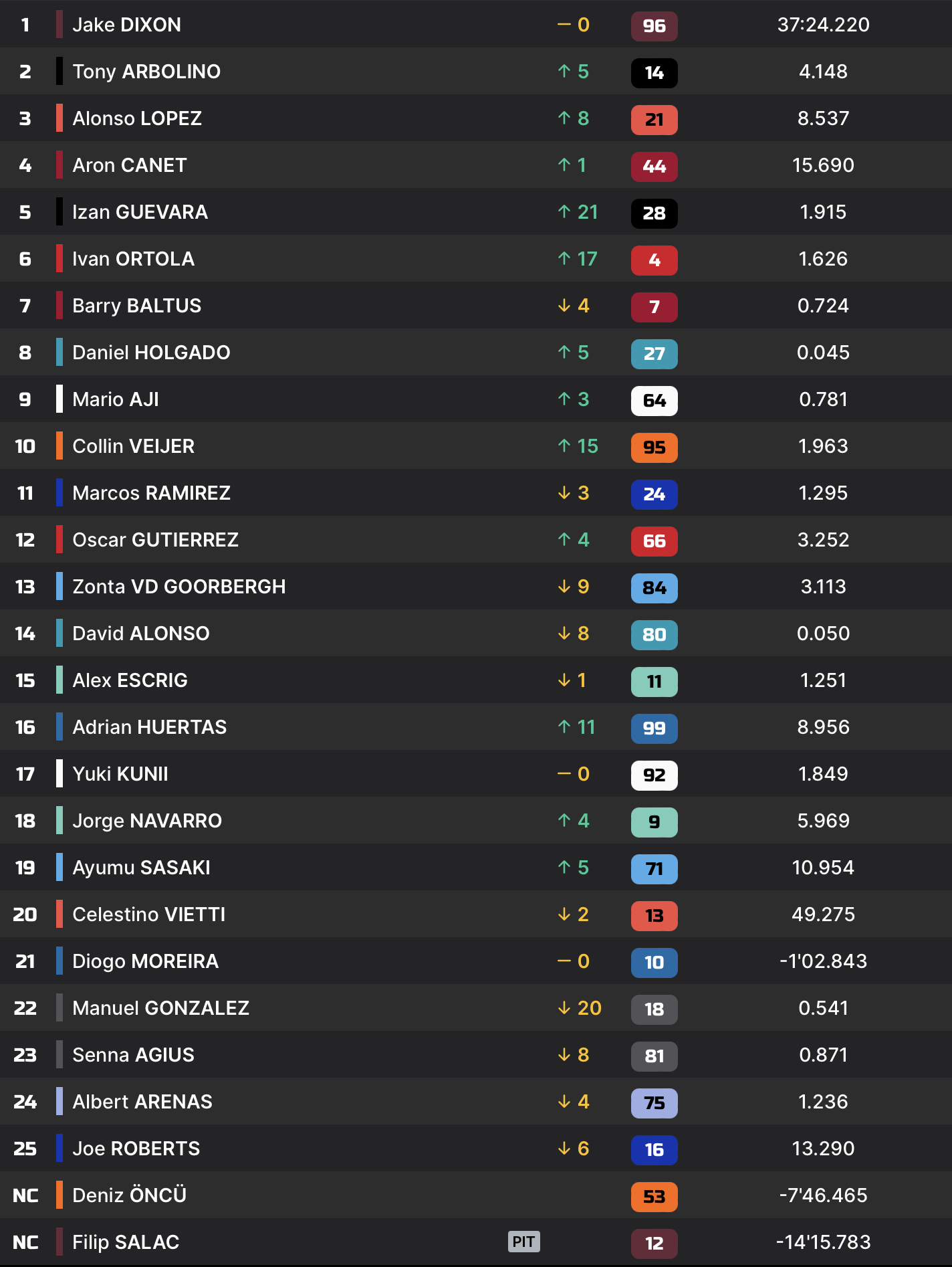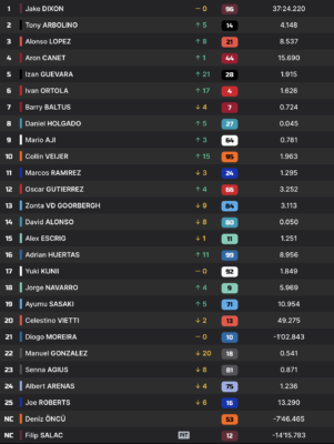 Après la mi-course, Jake Dixon est toujours inarrêtable. Il dispose maintenant de six secondes d’avance sur Tony Arbolino, tandis que Alonso Lopez complète le top-3. Celestino Vietti s’est quant à lui défait des deux pilotes Fantic, et évolue en quatrième position.