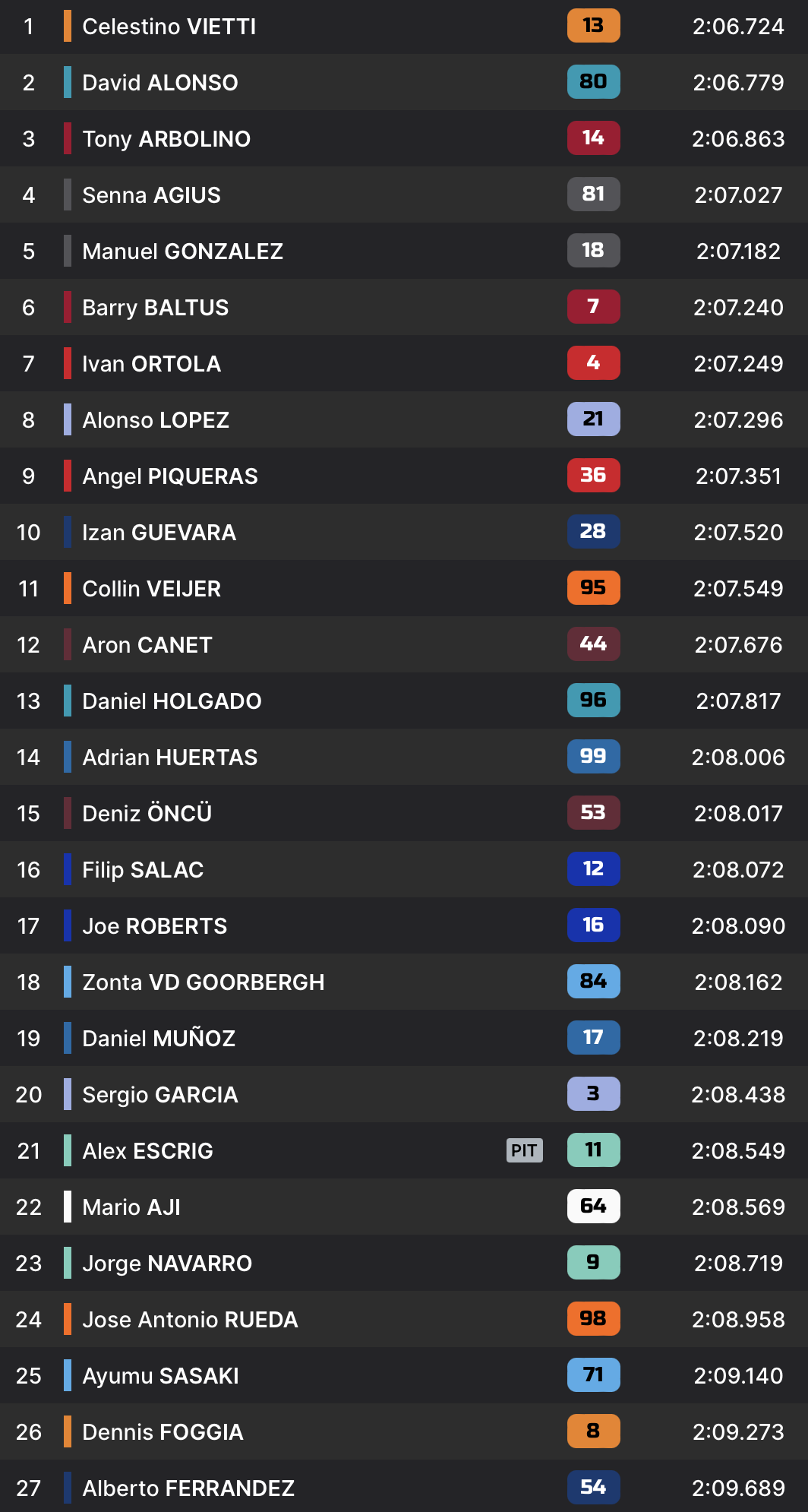 Durant les tous derniers instants, de nombreux pilotes améliorent encore en allant chercher la limite. C’est finalement Celestino Vietti qui se met en tête à la fin du temps imparti. Son temps en 2:06.724 relègue David Alonso à 55 millièmes.