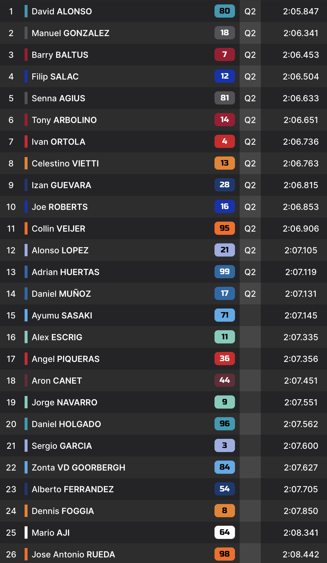À trois minutes du terme, David Alonso est venu mettre tout le monde d’accord avec un temps en 2:05.847, devenant le premier pilote à tourner sous les 2 minutes 06. Ce temps lui permet naturellement de remporter la séance et de décrocher son ticket pour la Q2. Son équipier, qui semblait être le seul à pouvoir le défier durant les dernières secondes de cette séance, a été piégé par les drapeaux jaunes dans le secteur 3 dans son dernier effort. 20e, Daniel Holgado devra passer par la Q1.