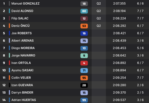 Derrière lui, David Alonso arrache la deuxième place avec un temps en 2:08.194. Le Colombien participe ainsi à sa première Q2 de l’année. Filip Salac et Deniz Oncu complètent le top-4, et passent donc eux aussi en Q2.