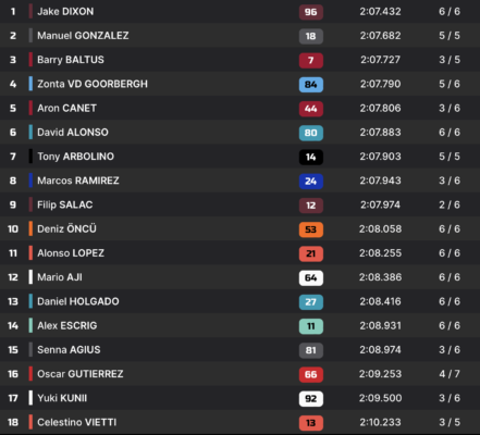 Devant le drapeau à damier, de nombreux pilotes améliorent cependant drastiquement. Jake Dixon et Manuel Gonzalez reprennent les commandes de la séance, le Britannique devant l’Espagnol, avec un chrono en 2:07.432. Personne ne sera en mesure de les battre, les deux rivaux partiront donc côte à côte demain lors de la course.