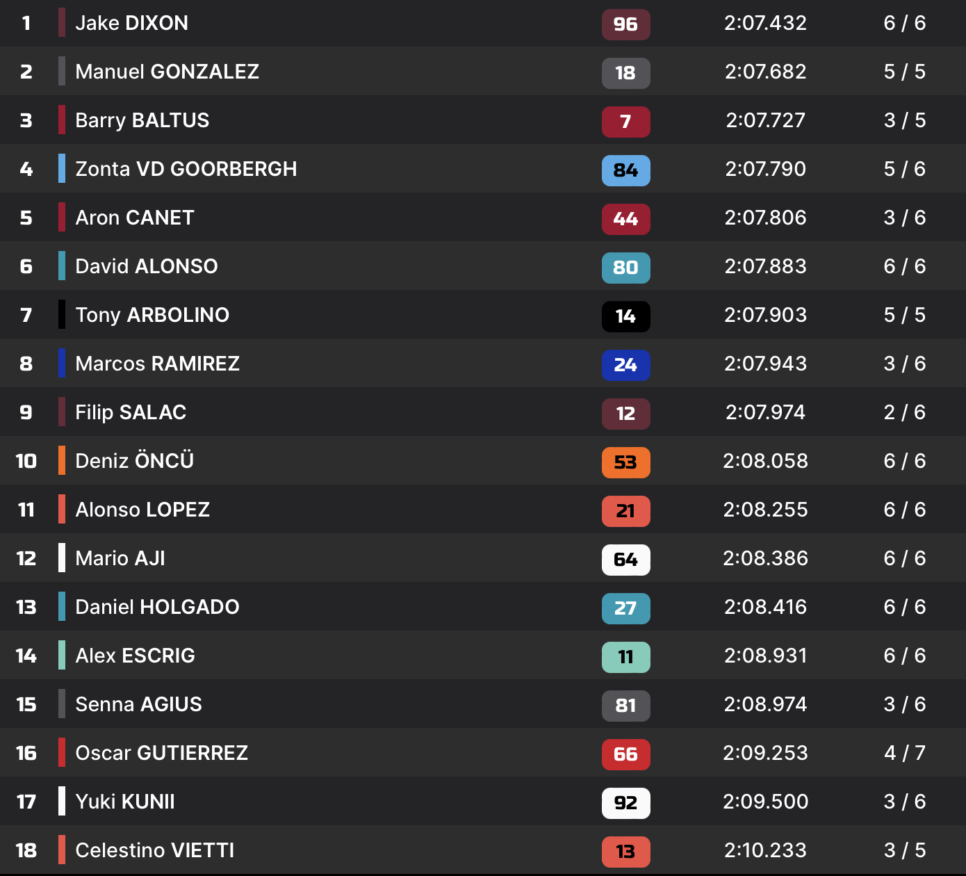 | Q2 | 2’07.631 Aron Canet | 2’07.432 Jake Dixon |
