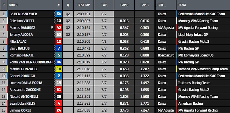 Le leader du classement mondial Celestino Vietti (Mooney VR46 Racing Team), auteur du 18e temps, devra passer par le « piège » de la Q1. Que vont nous réserver ces qualifications ? Avant de répondre à cette question, voici le tableau qui résume les faits connus jusque-là.