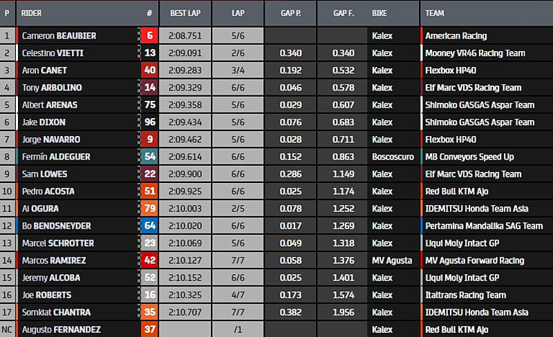 Vietti est leader devant Canet, Beaubier, Ogura et Ramirez. Mais c’est sans compter sur Arbolino qui malgré sa chute revient fort, il prend la 2e position. Beaubier frappe fort, il prend la pole provisoire en 2.08.751s.
