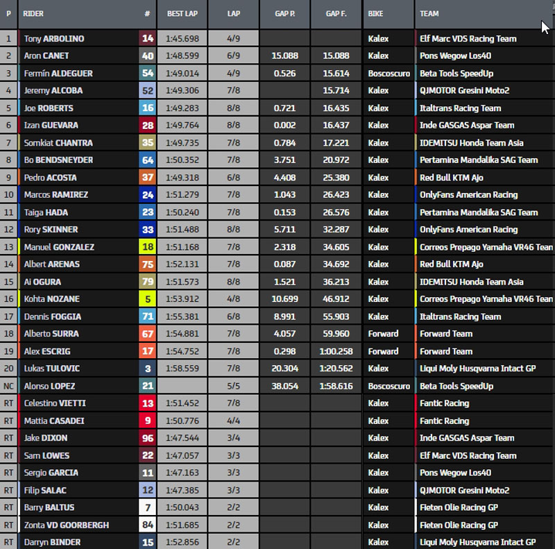 Avec tous ces événements, Pedro Acosta est remonté à la neuvième place à 16 tours du drapeau à damier. Il roule à 33 secondes du leader, mais moins vite que celui-ci.