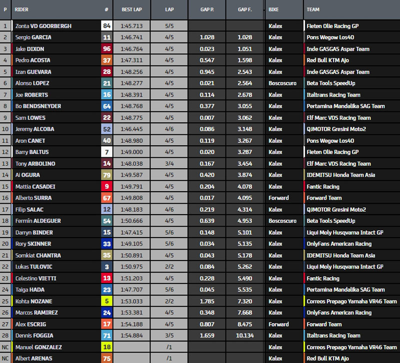 Quatrième temps et deuxième ligne pour Joe Roberts (Italtrans Racing Team), qui aura à ses côtés le leader du championnat Pedro Acosta et Jake Dixon (Inde GASGAS Aspar Team). Sergio Garcia (Pons Wegow Los40) est septième, devant le 2e du championnat Tony Arbolino (Elf Marc VDS Racing Team), qui s’élancera donc de la troisième ligne avec Darryn Binder (Liqui Moly Husqvarna Intact GP).