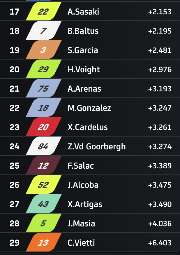 Côté chrono, Aron Canet est le premier à montrer des signes d’aisance sous les gouttes. Mario Aji démontre également quelques aptitudes à évoluer sur le mouillé, et ne lâche pas l’Espagnol d’un dixième au marquoir. Derrière, les habituels hommes de tête tiennent leur rang. Alonso Lopez, Tony Arbolino et Ai Ogura complètent ainsi le top-5.