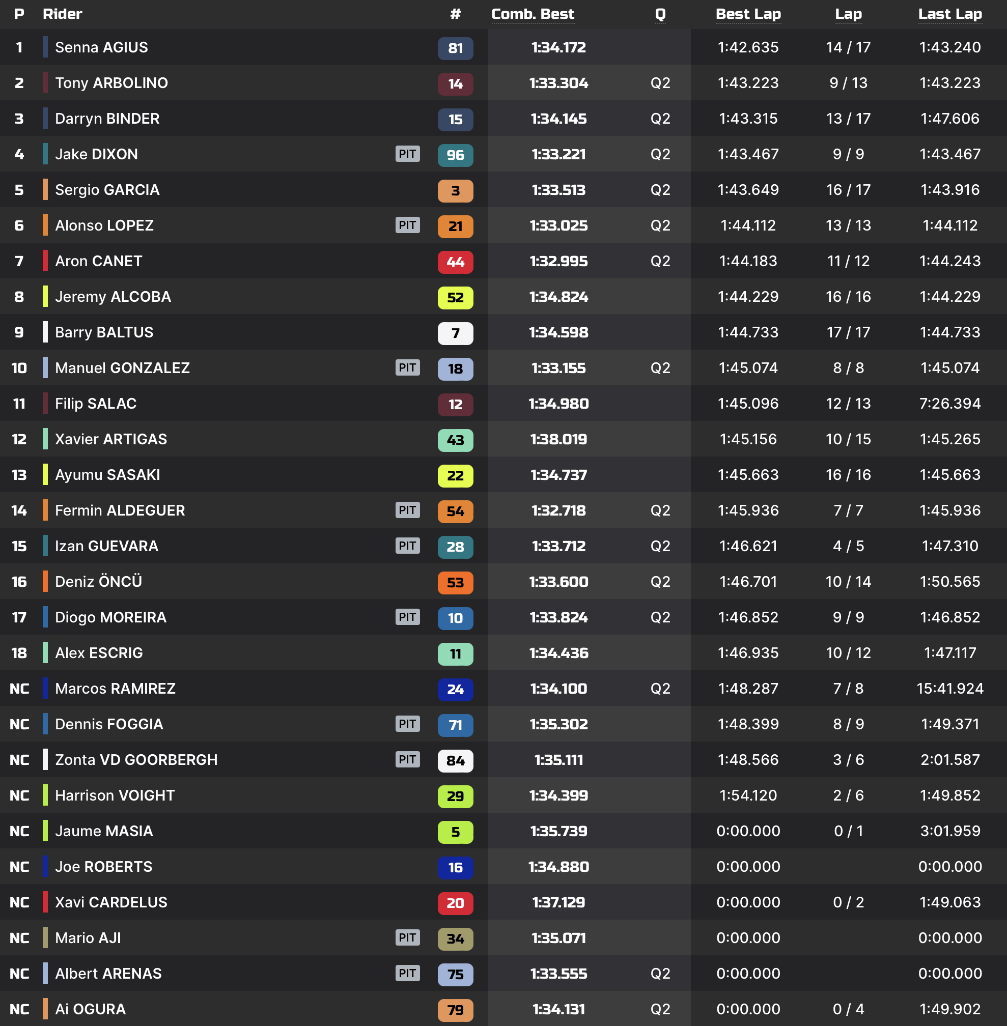 Devant le drapeau à damier, Agius est intouchable, et signe le meilleur temps d’une séance qui fut finalement peu utile. Au total, 18 pilotes enregistrent un chrono, certains ont au contraire éviter tout risque, comme c’est le cas du leader du championnat, Ai Ogura.