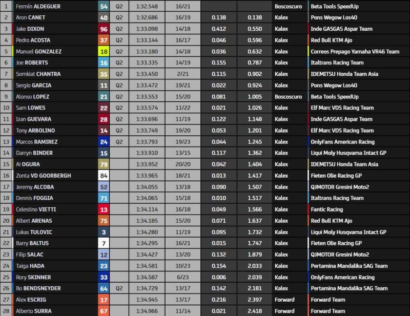 Fermin Aldeguer conclut donc cette P2 Moto2 en tête, confortablement devant Aron Canet et Jake Dixon.