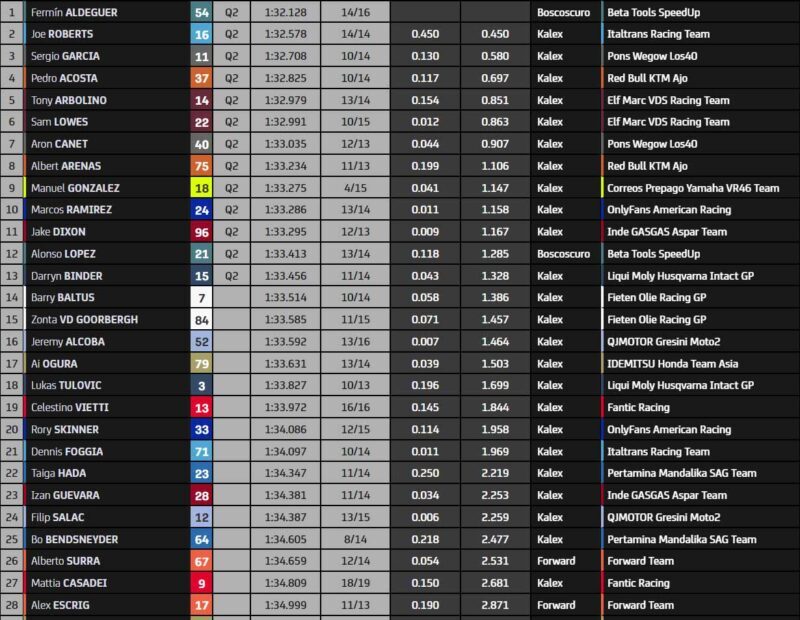 C’est donc Fermin Aldeguer qui termine cette séance en tête, devant Joe Roberts et Sergio Garcia. Pedro Acosta suit à la quatrième place.