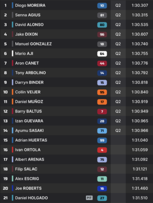 Daniel Holgado, qui peut s’offrir ce week-end le titre de rookie de l’année, n’est que 21e devant le drapeau à damier. Il passera par la Q1 avec Joe Roberts, 20e.