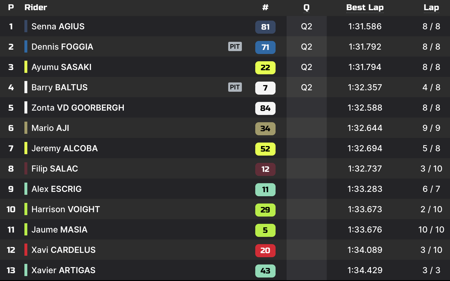 | P2 | 1’32.128 Fermin Aldeguer | 1’34.172 Senna Agius |
