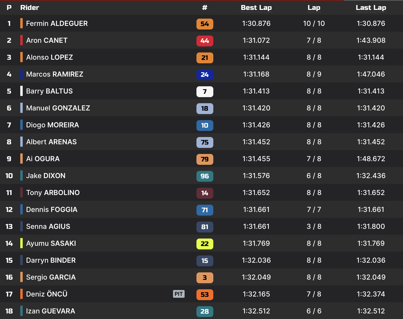 Le second time attack d’Aron Canet débute, et il semble alors déterminé à déloger Aldeguer de la pole provisoire, ce qu’il parvient à faire avec un tour en 1:31.184, avant de se mettre à l’abri en 1:31.072.