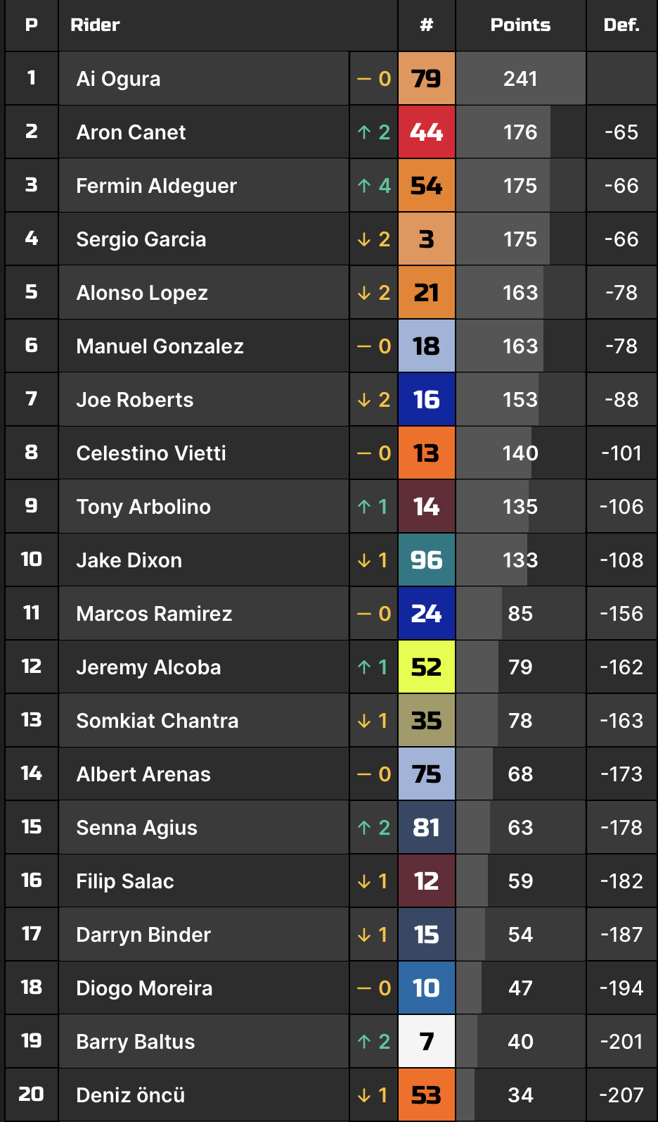 Devant lui, Ogura n’a malgré tout rien pu faire face à Aron Canet et Fermin Aldeguer qui, grâce à ce bon résultat, ont respectivement gagné deux et quatre places au championnat. Alors que le n°44 se porte désormais à soixante-cinq longueurs d’Ai Ogura au classement Pilotes, Aldeguer compte, comme Garcia, soixante-six unités de retard sur la tête.