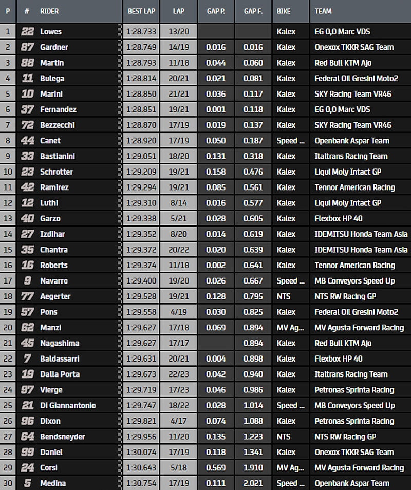 Il reste 13min avant la fin de séance, et Lowes vient jouer les troubles-fête, rappelons que le weekend passé il avait dominé toutes les séances d’essais libres. Il signe un chrono en 1.28.733s. Martin, Bezzecchi, Schrotter, Luthi, Garzo, Izdihar, Roberts, Fernandez et Navarro viennent clore le top10. Bastianini pointe au 23e rang, Marini est 15e.