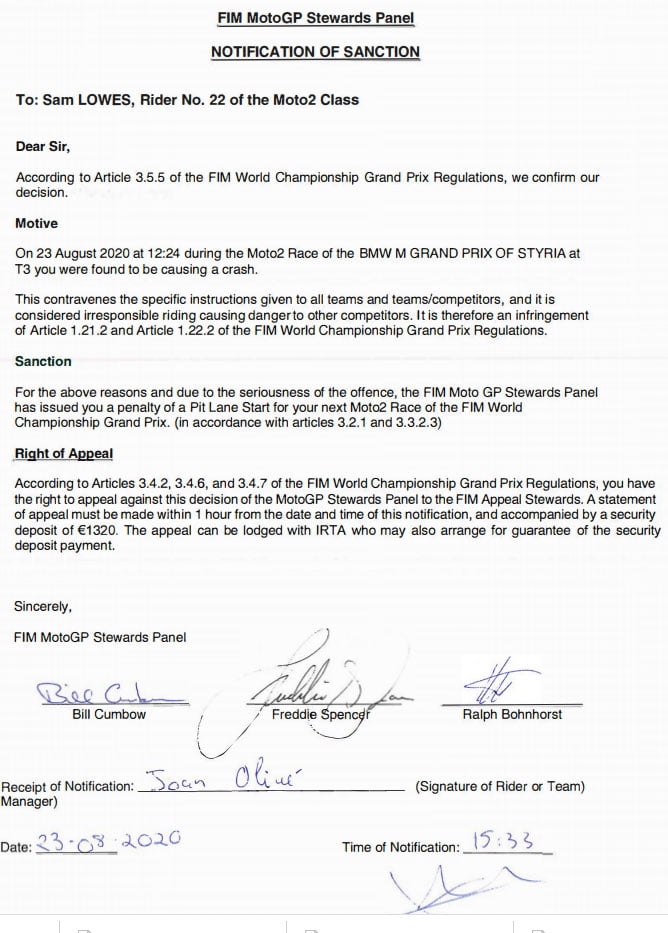 Les commissaire MotoGP de la FIM ont répondu à ce qu’ils considèrent comme une conduite irresponsable et dangereuse par la décision suivante : Sam Lowes partira de la pit lane lors de la prochaine course à Misano.