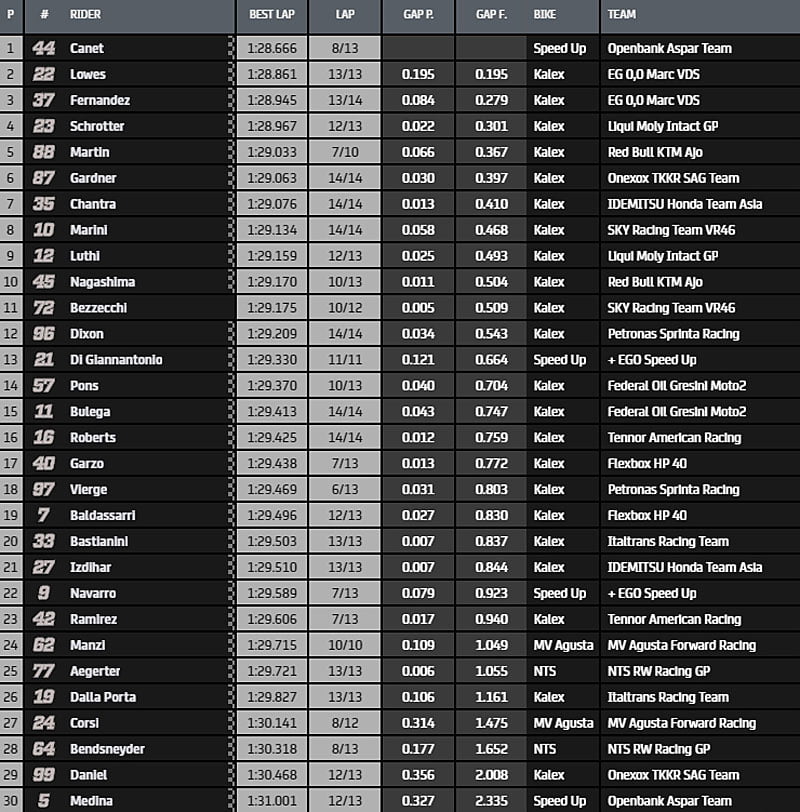 Très vite, Canet prend les commandes en passant la barre des 1.30 avec un temps au tour en 1.29.401s devant Marini (1.29.709s) et Dixon (1.29.765s). Canet enfonce le clou en améliorant son chrono en 1.29.250s. Il est suivi dans son effort par Bezzecchi qui s’empare du 2e meilleur temps en tournant en 1.29.277s.