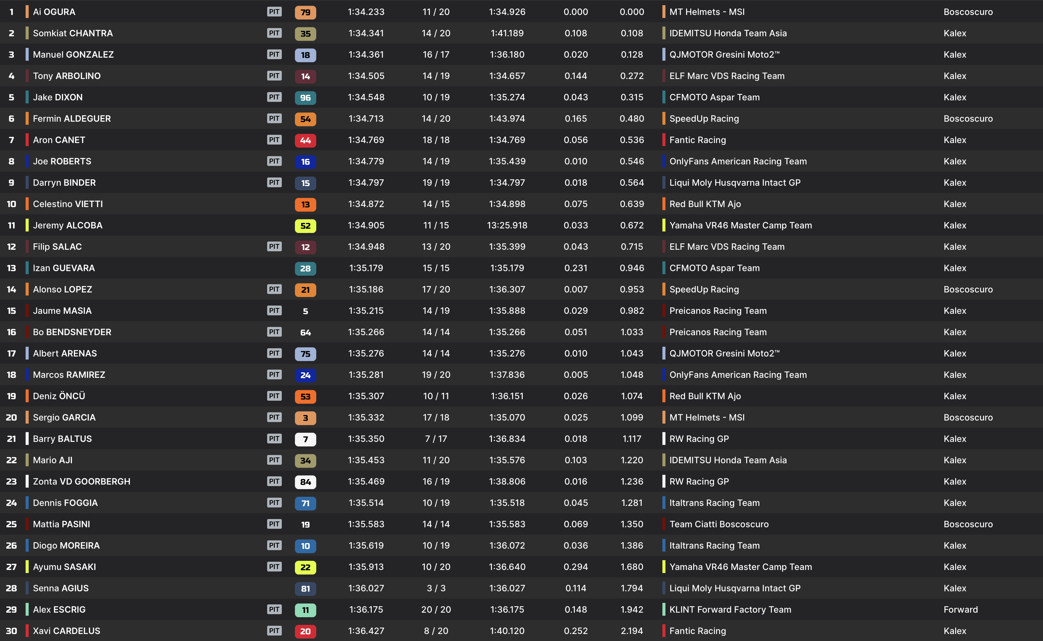 À noter les chutes de Senna Agius et Mattia Pasini en début de séance. Après avoir effectué un beau sauvetage en début de session, Manuel Gonzalez a chuté au virage 4 à trois minutes de la fin du temps imparti et semble s’être fait mal. Il faudra surveiller son état pour la suite du week-end.