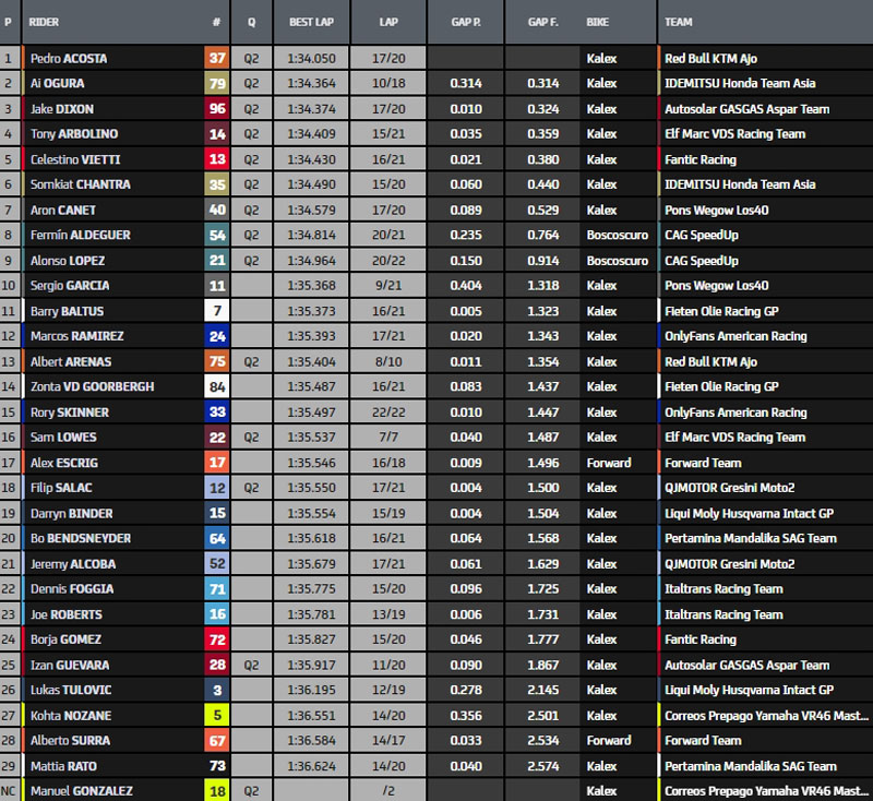 Sous le drapeau à damier, Acosta garde son bien devant Ogura, Dixon, Arbolino et Vietti. Chantra est sixième mais second au classement combiné. Malgré sa chute, Sam Lowes sauve sa place provisoire en Q2 grâce à son chrono du matin.