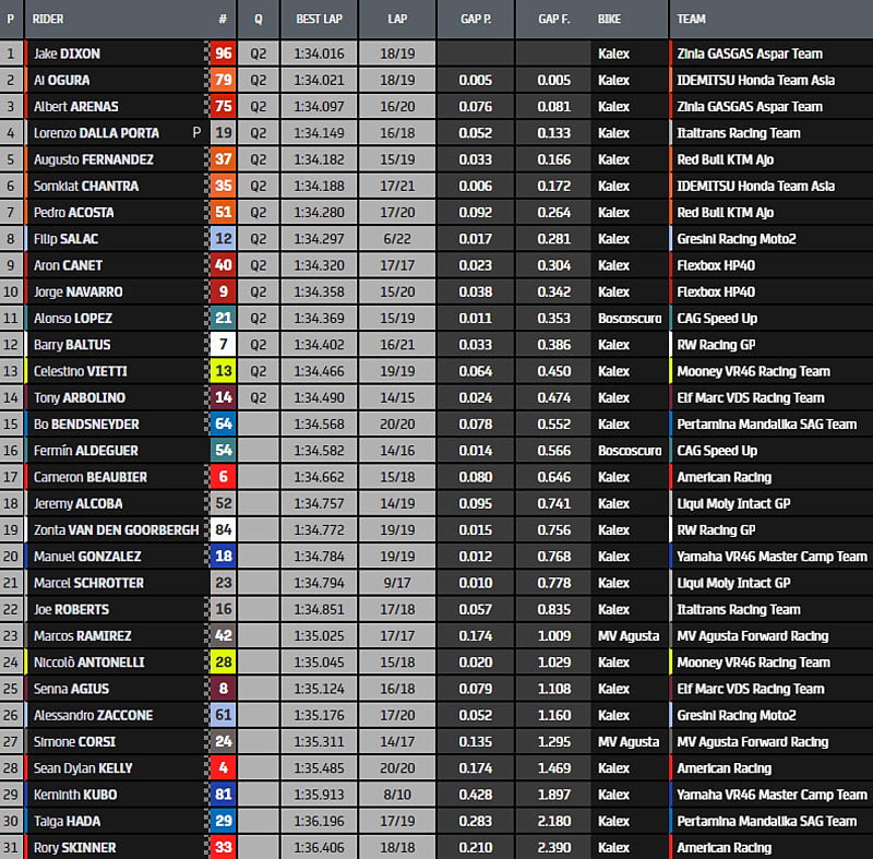 Le leader Augusto Fernandez (Red Bull Ajo) est troisième, devant Tony Arbolino (Marc VDS) et Alonso Lopez (Speed Up). Cameron Beaubier (American Racing) est sixième, devant Fermin Aldeguer (Speed Up), Filip Salac (Gresini), Jorge Navarro (Pons) et Lorenzo Dalla Porta (Italtrans) qui clôture le Top Ten. Les pilotes du Team Aspar Jake Dixon, le plus rapide de FP1 et Albert Arenas, Joe Roberts (Italtrans) et Bo Bendsneyder (SAG Team) se sont également qualifiés pour la Q2 provisoire. Le troisième larron de la course au titre Celestino Vietti (Mooney VR46 Racing Team) est seulement 15è.