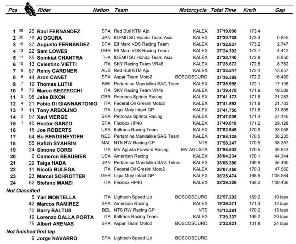 « Ce fut une course très difficile. J’ai attaqué dès le début alors que j’étais vraiment à la limite. Durant la course j’ai bien eu quelques opportunités, mais dans les cinq derniers tours Raúl Fernández avait quelque chose en plus et je n’ai rien pu faire. Je suis content de ce premier podium dans la catégorie, et nous avons trouvé de nouvelles choses ce weekend que nous allons pouvoir appliquer à l’avenir. Je suis très content de ce weekend. »