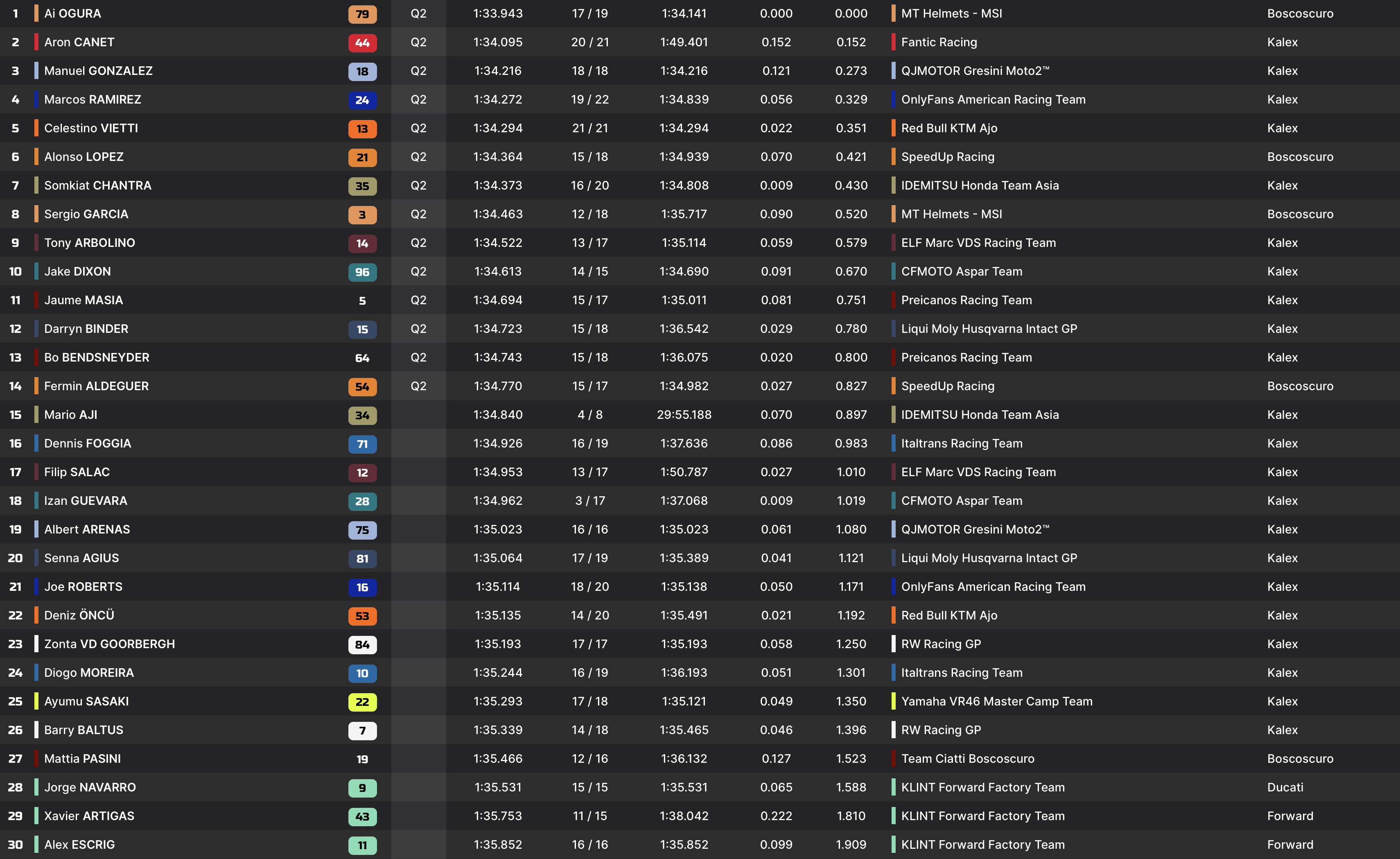 Les mêmes hommes que dans la matinée rythment le début de séance, et Ai Ogura se démarque rapidement. Aron Canet et Somkiat Chantra bloquent quand à eux le top-3 provisoire après 15 minutes de roulage.