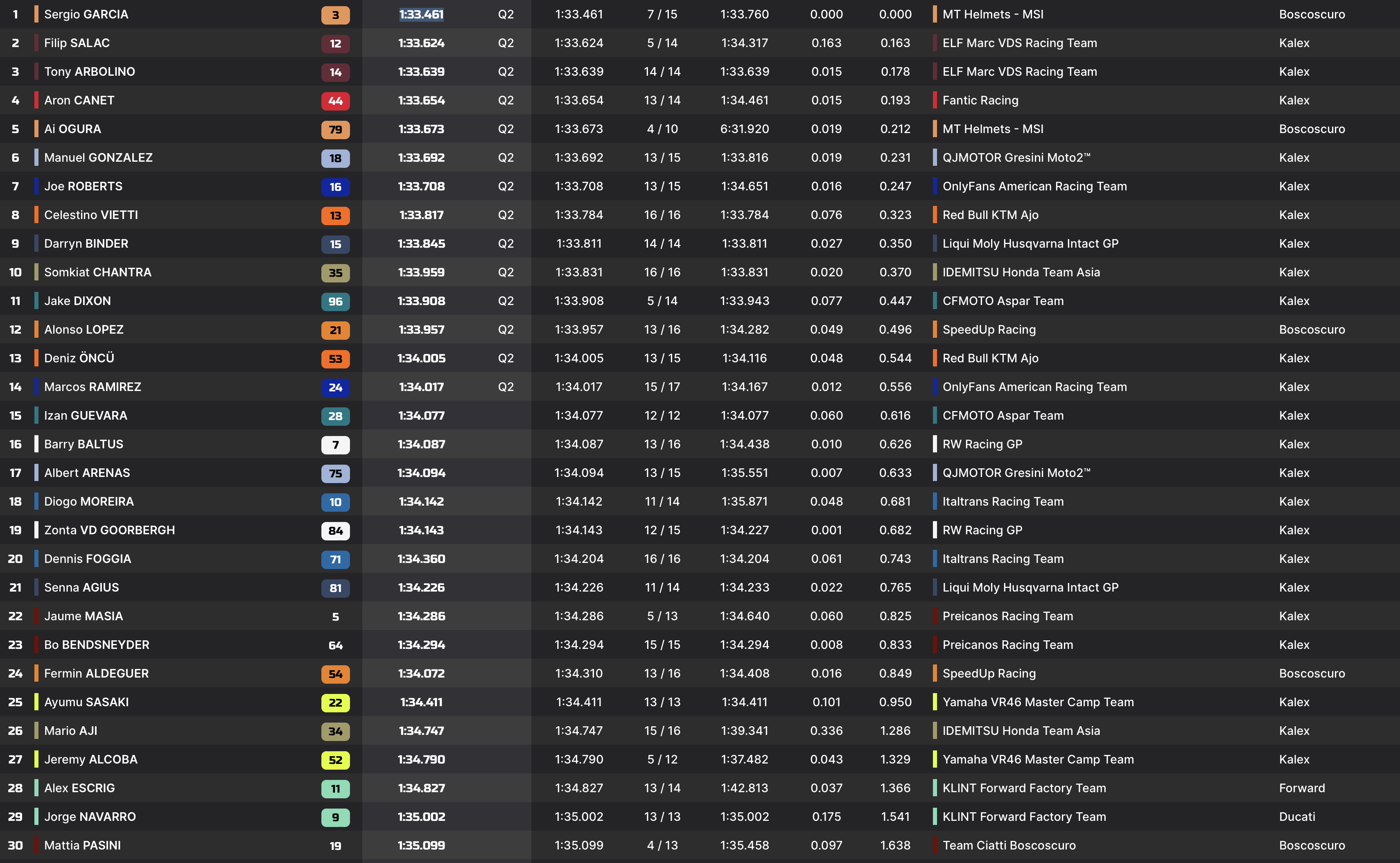 Devant le drapeau à damier, les choses n’évoluent pas en tête du classement. Sergio Garcia boucle la P2 avec la première place, devant Filip Salac. Tony Arbolino se hisse en troisième position lors de son dernier effort, devançant Aron Canet.
