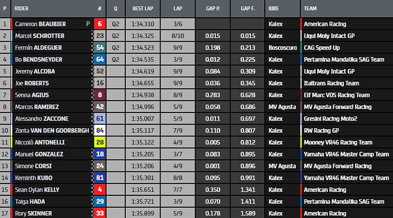 Les chronos s’enflamment et Beaubier prend les commandes à son tour en 1.34.310s. Il devance Schrotter, Bendsneyder et Aldeguer qui seraient les 4 pilotes qui rejoindraient la Q2