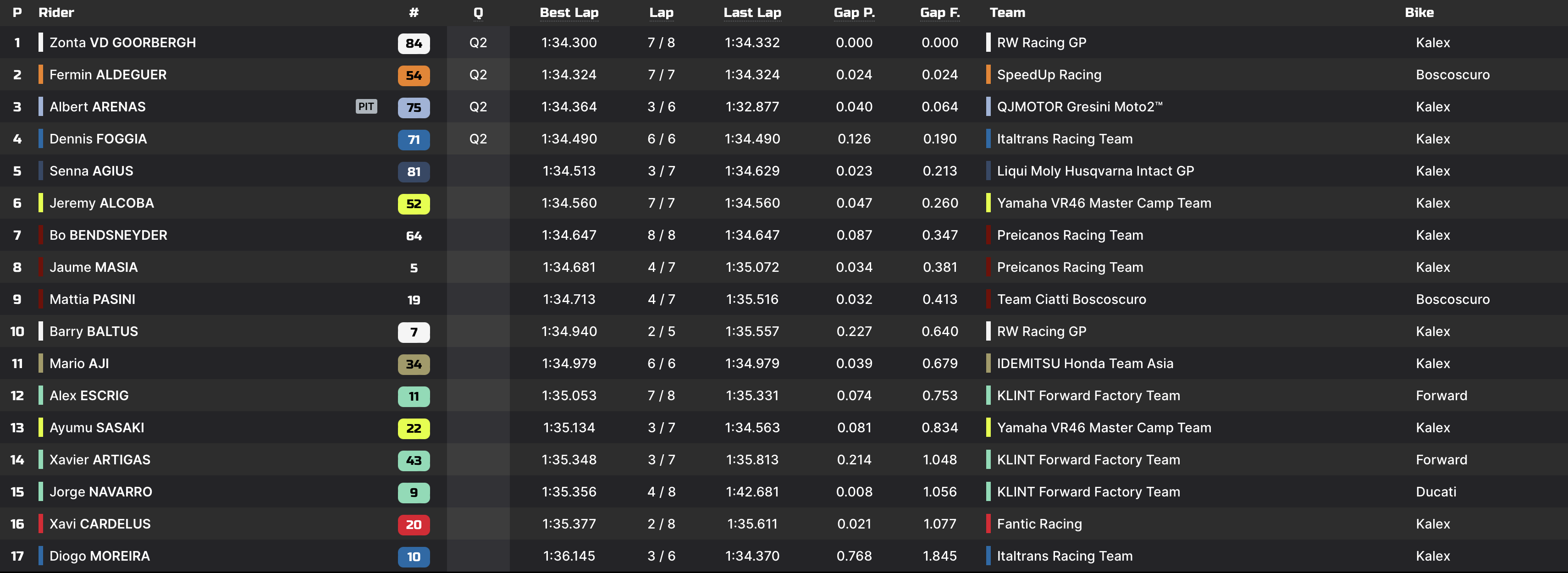 Alors que de nombreux pilotes améliorent devant le drapeau à damier, Dennis Foggia parvient à se démarquer pour s’offrir la quatrième place de cette première partie de séance qualificative, et ainsi sécuriser une place dans les 18 premiers en prenant part à la Q2.