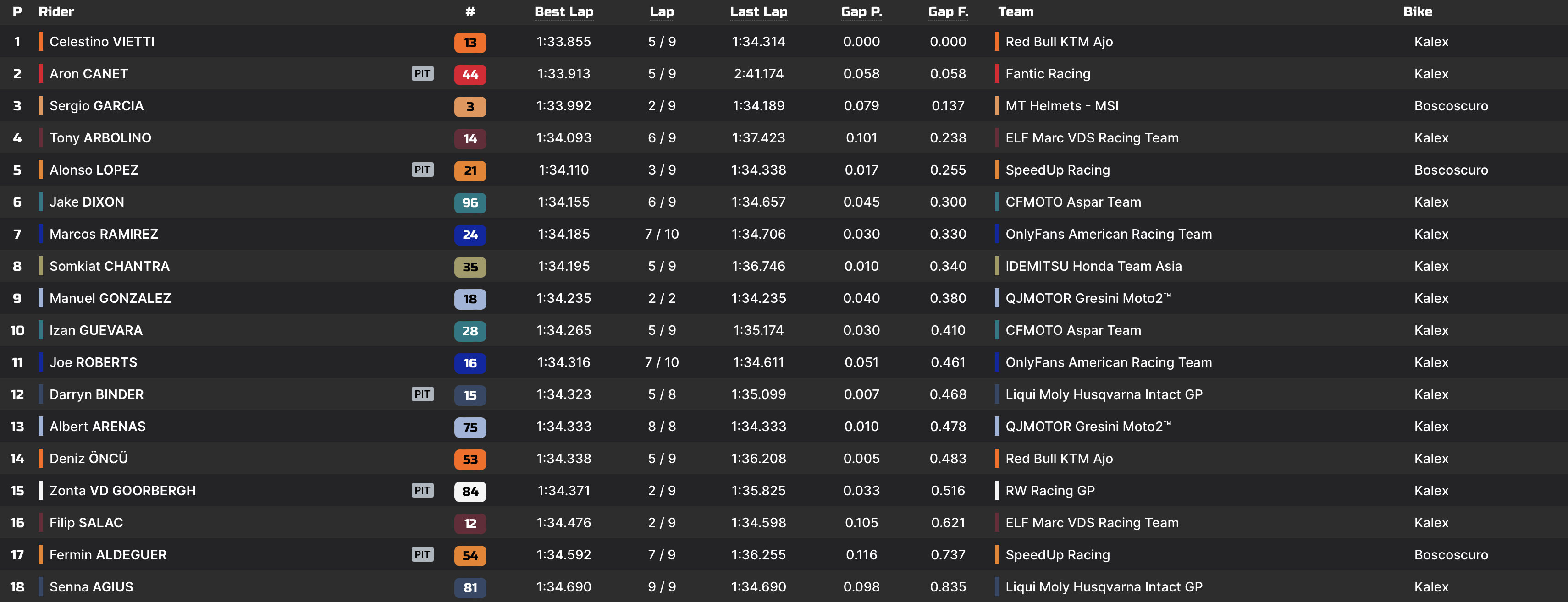 Albert Arenas a gardé le contrôle tout au long de cette sortie en piste. Il revendiquait ainsi la tête jusque dans les derniers instants. Rentré au box, il se fera doubler par Fermin Aldeguer, et par un Zonta van der Goorbergh revigoré, venu arracher la première position sur le fil.