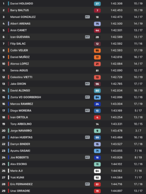 Au cours des dix dernières minutes de la FP1, les chronos rapides s’enchaînent. Plusieurs pilotes revendiquent brièvement la référence, et menacent bientôt de prendre le record du tour. Daniel Holgado s’illustre finalement avec un temps en 1:42.306, qui ne sera pas battu. Il reste malgré tout à bonne distance du meilleur tour de la piste, détenu par Aron Canet. L’Espagnol avait établi cette marque lors de la Q2 lors de la dernière venue de la discipline sur le circuit.