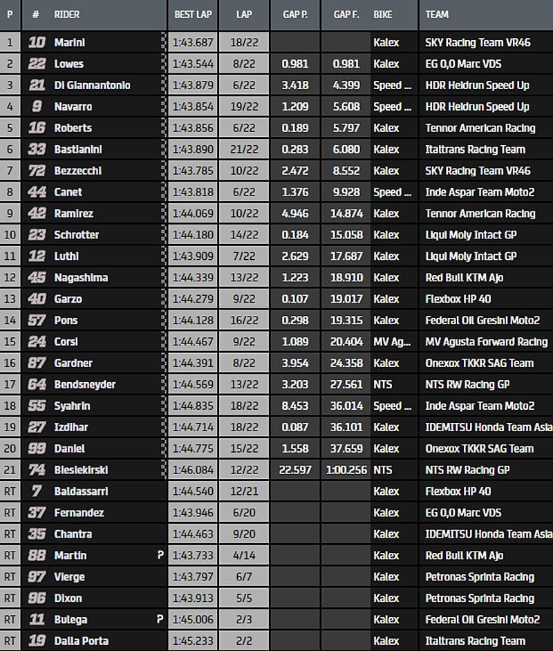 Sous la pression de Lucas Marini, Sam Lowes commet de toutes petites erreurs qui permettent à l’Italien d’être immédiatement dans sa roue à trois tours de l’arrivée. Au tour suivant, ce dernier profite de l’aspiration de la moto numéro 22 pour reprendre le commandement.