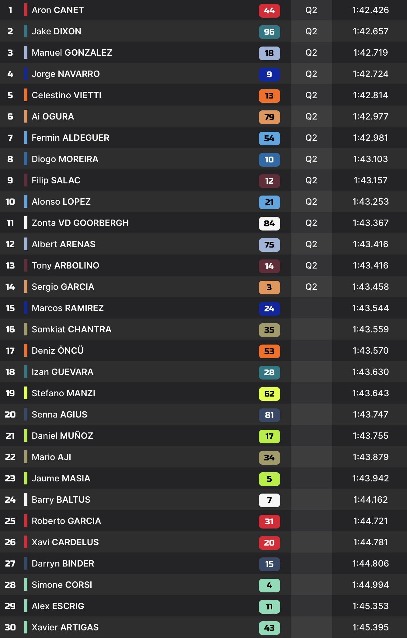 Lors des dernières tentatives, ces marques tombent enfin de manière significative, et le plein potentiel des machines commence à s’exprimer. Aron Canet boucle le 17e tour de sa séance en 1:42.426, soit une demi-seconde plus lent que la pole position obtenue par Sergio Garcia en mai, mais déjà quatre dixièmes plus rapide que le meilleur chrono réalisé le vendredi après-midi lors du Grand Prix de Catalogne.