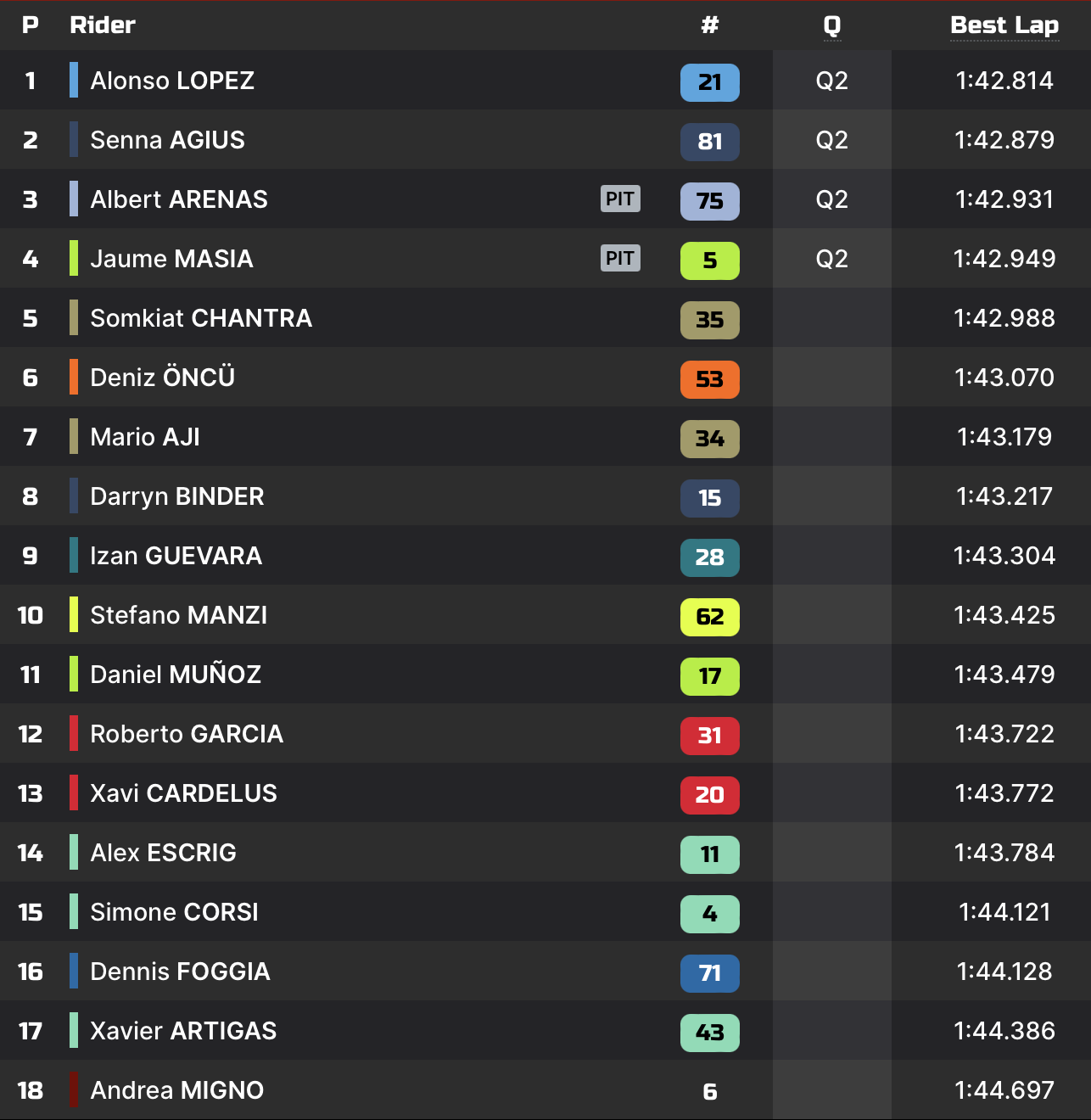 Le n°21 conclut la Q1 au même classement, devant Senna Agius, Albert Arenas et Jaume Masia, qui se qualifient également pour la seconde partie de séance qualificative. Somkiat Chantra, qui effectuera ses premiers pas en MotoGP mardi prochain dans le team LCR, échoue aux portes du top-4 pour une poignée de millièmes.