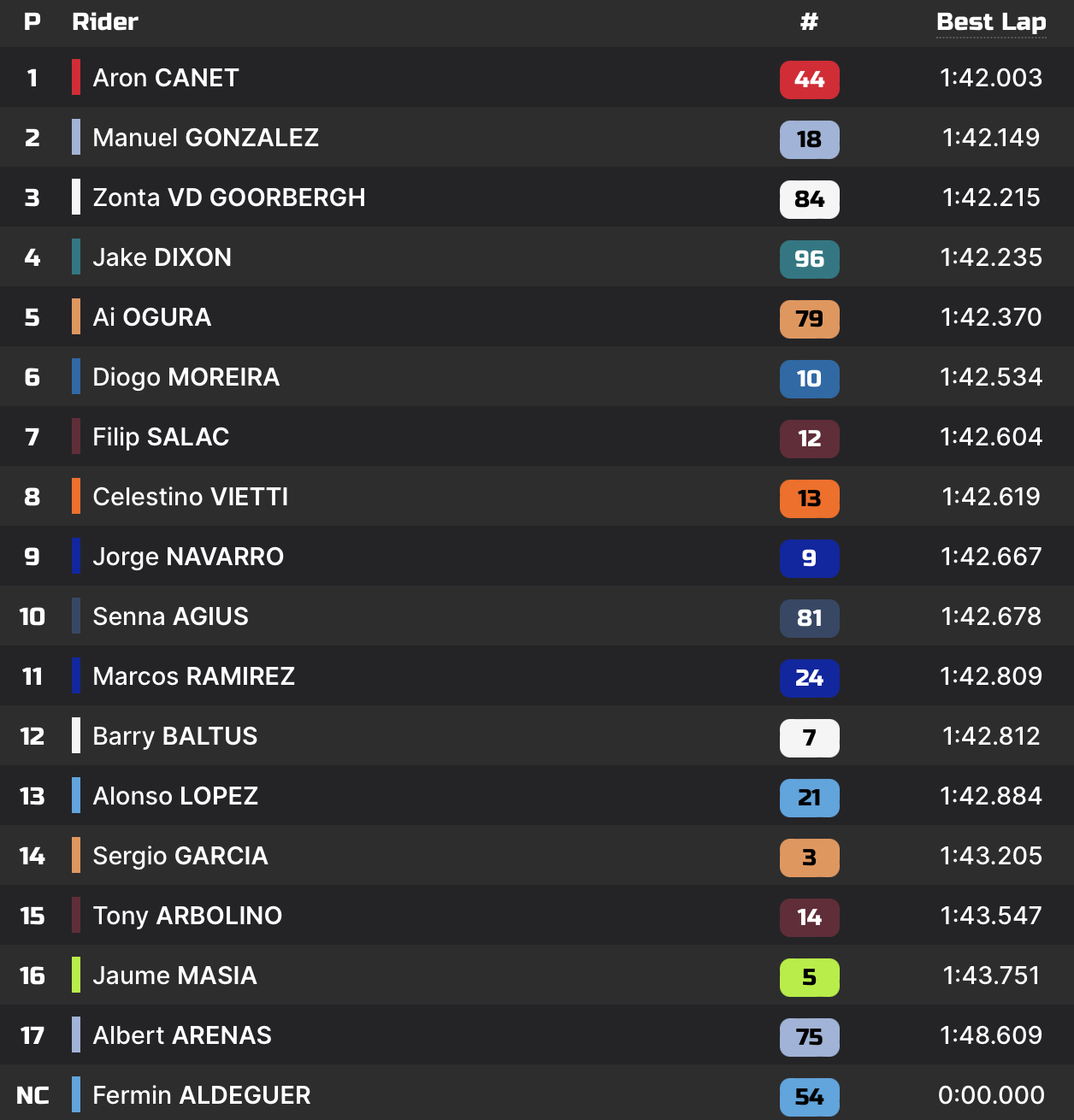 | FP | 1’42.860 Manuel Gonzalez | 1’42.998 Aron Canet |