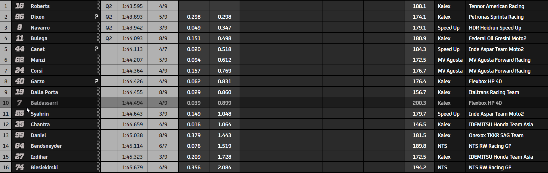 Enea Bastianini, Edgar Pons, Tom Lüthi qui rejoindra l’Onexox TKKR SAG Team en 2021 et Tetsuta Nagashima, parti à la faute dans le virage 2 dans les toutes dernières minutes tout comme Enea Bastianini, étaient les derniers qualifiés d’office en Q2…