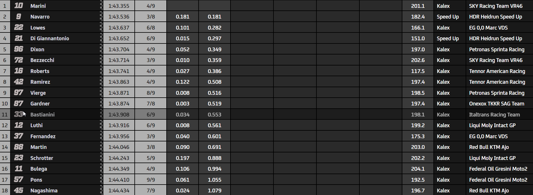 Dernière minute et le top3 est le suivant: Marini, Navarro et Lowes. Di Giannantonio, Dixon, Bezzecchi, Roberts, Ramirez, Vierge et Gardner composent le top10.