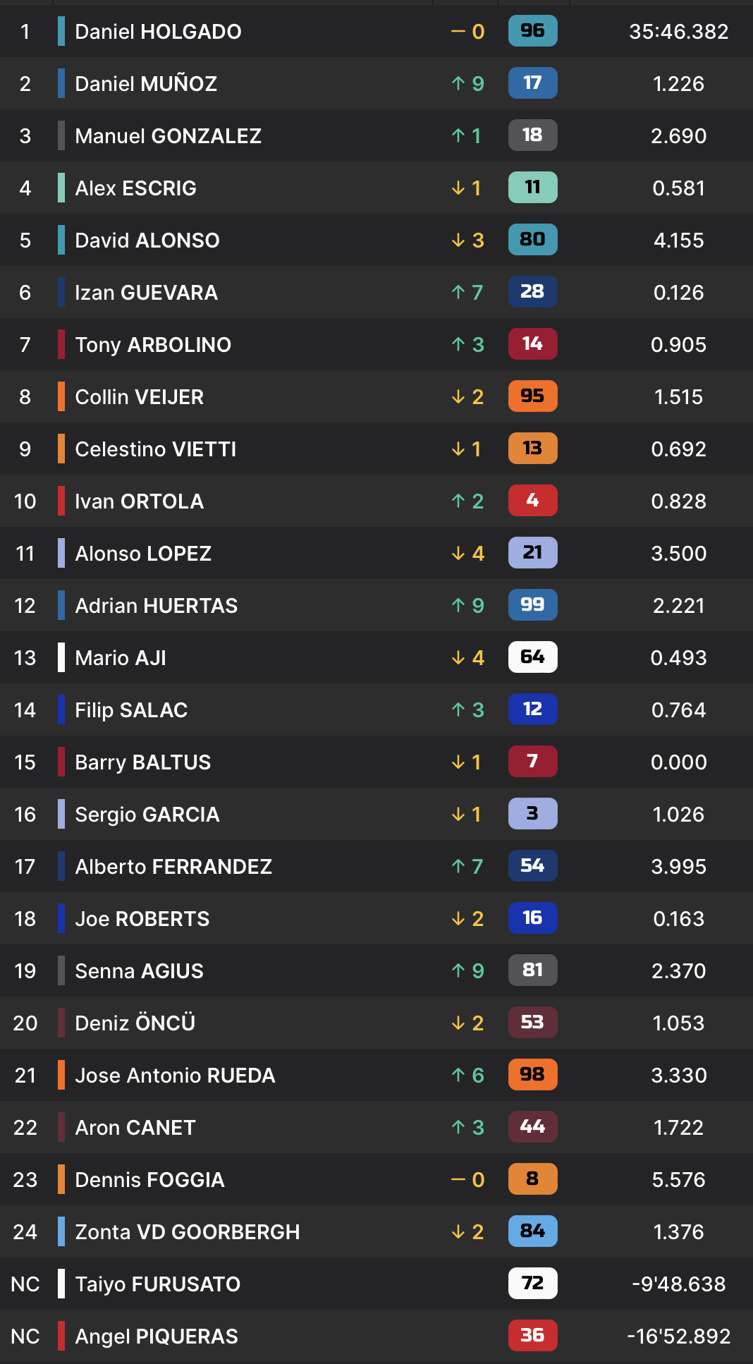 À mi-course, Daniel Holgado comptait près d’une seconde d’avance sur Daniel Munoz, tandis qu’Alex Escrig a également bien creusé l’écart par rapport à Manuel Gonzalez. Il n’y a encore plus beaucoup d’action aux avant-postes.