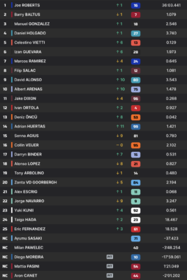 Pas de Brabançonne la veille de la fête nationale belge, mais une excellente opération au championnat, puisque Barry Baltus, en plus de reprendre quelques points au leader, se promeut au troisième rang du classement général. Un résultat bien aidé par les abandons de Diogo Moreira et d’Aron Canet. Pour Manuel Gonzalez, le bilan est encore plus réjouissant, puisqu’il compte désormais 25 points d’avance sur son compatriote.