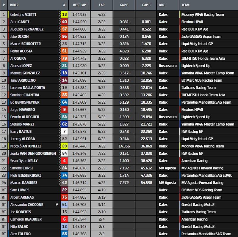 Au championnat, Celestino Vietti reprend un peu d’air, avec 133 points contre 117 à Ai Ogura et 109 à Arón Canet.