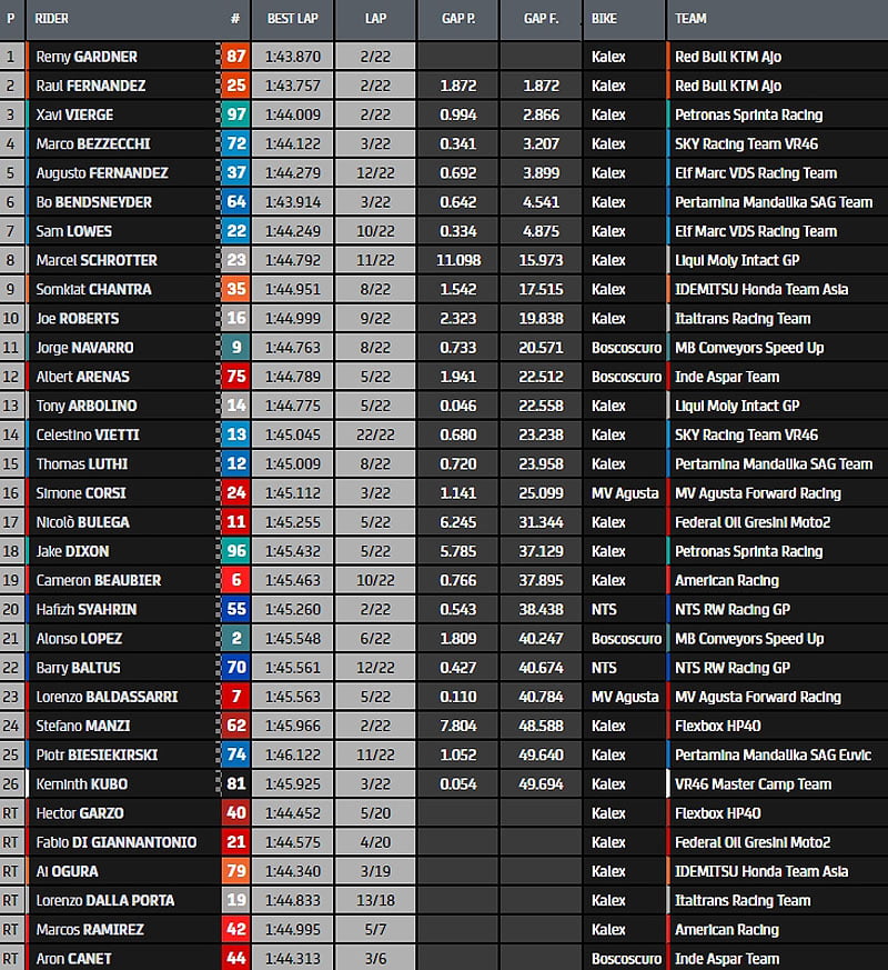 Il reste 5 tours avant la présentation du drapeau à damiers, Raul Fernandez profite d’une légère avance sur Remy Gardner, qui reste relativement proche et pourrait profiter du moindre écart de son coéquipier. L’écart avec Xavi Vierge se réduit doucement. Marco Bezzechi a lui aussi passé Bo Bendsneyder, qui rétrograde à la 5e position.