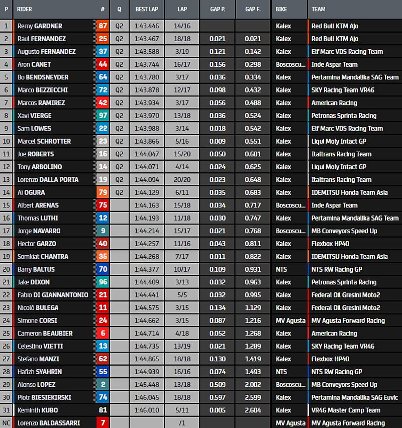 Le top14 pour la Q2 est composé des pilotes suivants: Gardner, R.Fernandez, A.Fernandez, Canet, Bendsneyder, Bezzecchi, Ramirez, Vierge, Lowes, Schrotter, Roberts, Arbolino, Dalla Porta et Ogura.