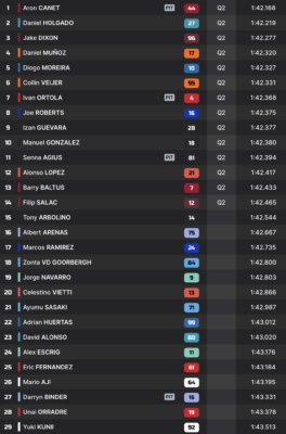 Une chute de Collin Veijer au virage 1 empêche ensuite les autres d’améliorer, et le classement de fige selon la hiérarchie suivante : Aron Canet, Daniel Holgado, Jake Dixon. Manuel Gonzalez se classe dixième, et se qualifie donc pour la Q2. Barry Baltus termine 13e, et est donc assuré d’un samedi matin tranquille également.