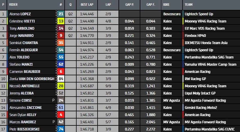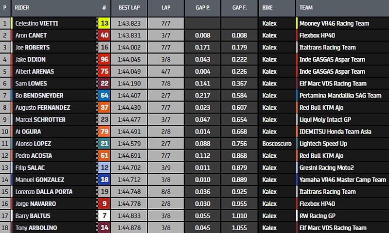 Navarro fait l’effort et s’empare du 4e meilleur temps en 1.44.770s. Arbolino en fait de même et prend le 2e meilleur temps en 1.44.549s. Mais Vietti confirme sa bonne forme, il reprend la 2e position en 1.44.490s.