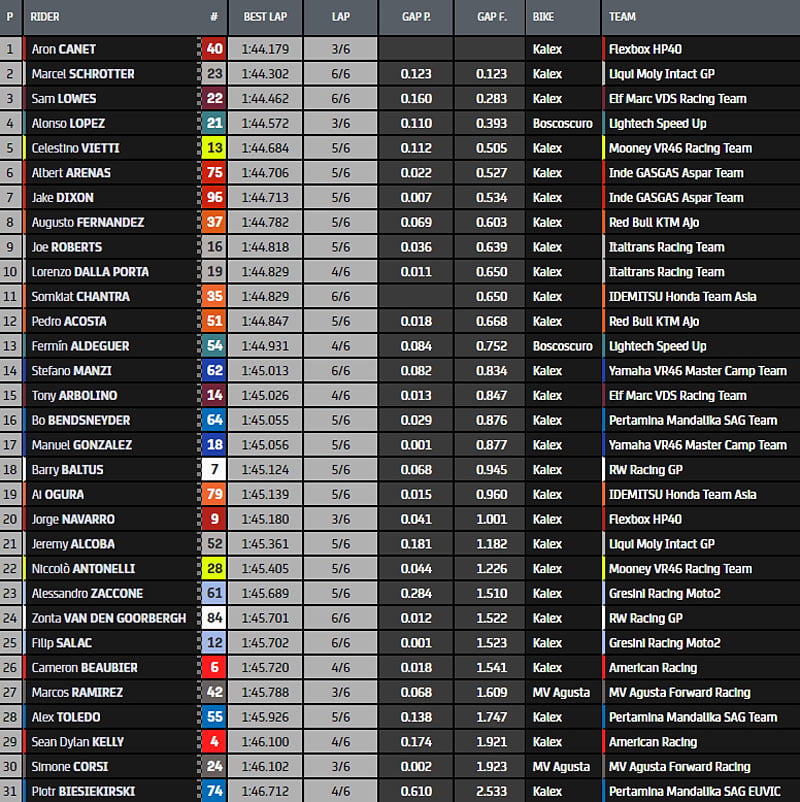Les deux porte-drapeaux de l’équipe GASGAS, Jake Dixon et Albert Arenas ouvrent la deuxième ligne suivis de Sam Lowes (Marc VDS) et Bo Bendsneyder (SAG). Huitième temps pour Augusto Fernandez (Ajo) qui devance Marcel Schrotter (Intact GP) et Ai Ogura (Team Asia) qui complète le top dix.