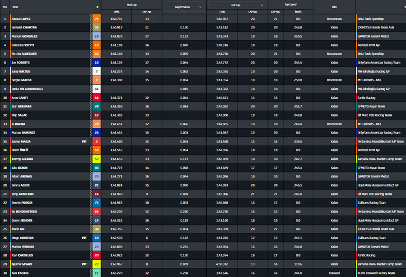 Alors qu’il dispute son deuxième week-end de course en Moto2, Matteo Ferrari achève la séance en 27e position. La Wildcard de Forward Racing GP, Jorge Navarro, n’a pas enregistré le moindre chrono et termine de son côté au 32e rang.