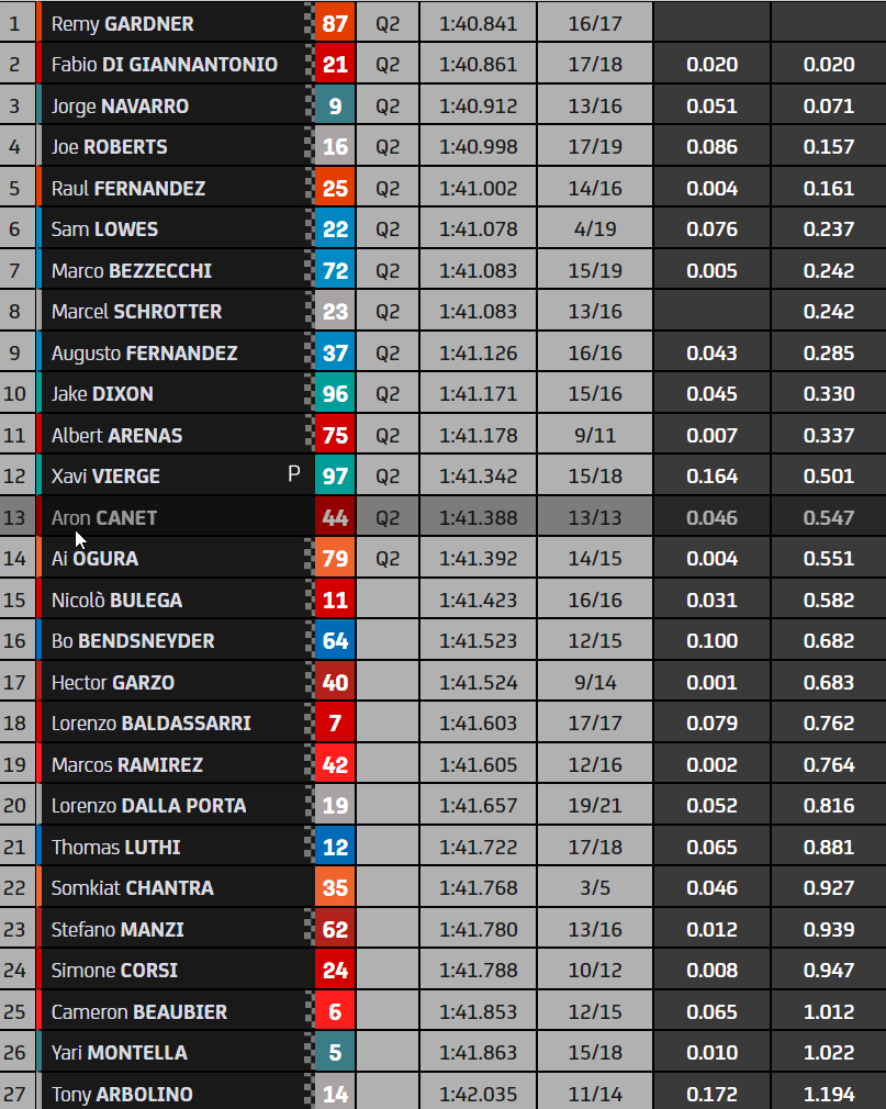 Les 14 qualifies pour la Q2 sont: Gardner, Di Giannantonio, Navarro, Roberts, R.Fernandez, Lowes, Bezzecchi, Schrotter, A.Fernandez, Dixon, Areans, Vierge, Canet et Ogura.